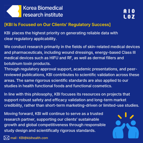 'AIOLOZ is a specialized clinical test brand that verifies effectivenessand safety of all skin related-products (drugs, medical devices,health functional foods, cosmetics, fiber etc.) under the supervision of KBI.