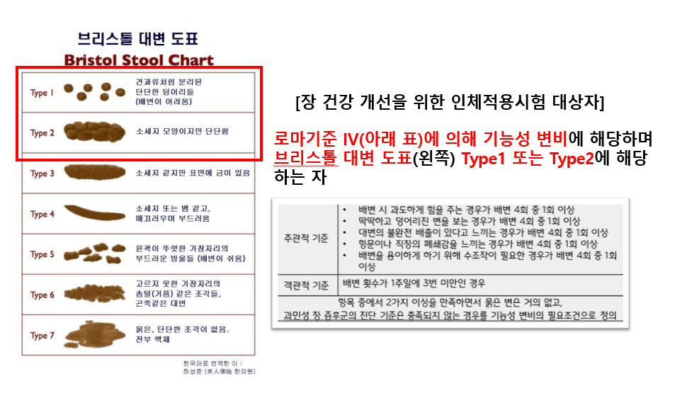 - Æò±Õ ÁÖ 1ȸ ÀÌ»ó Bristol stool scale 1–2¿¡ ÇØ´çÇÏ´Â ¹èº¯ÀÌ 25% ÀÌ»óÀ̸ç, ÇØ´ç Áõ»óÀÌ 6°³¿ù Àü ½ÃÀ۵Ǿî ÃÖ±Ù 3°³¿ù µ¿¾È ¹Ýº¹ÀûÀ¸·Î ¹ß»ýÇϰí, º¹ÅëÀÌ µ¿¹ÝµÇÁö ¾Ê¾Æ IBS-C¿¡ ÇØ´çÇÏÁö ¾Ê´Â ÀÚ